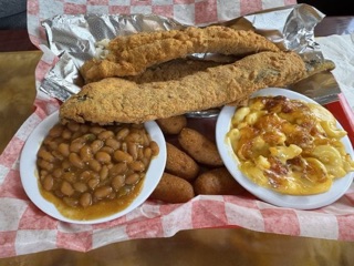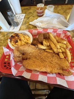 What a filling and delicious meal! Fried catfish slaw fries hush puppies and tea. A poster meal of the south ;-). The building looks tired but the food is certainly fresh. Get the chocolate cake to go